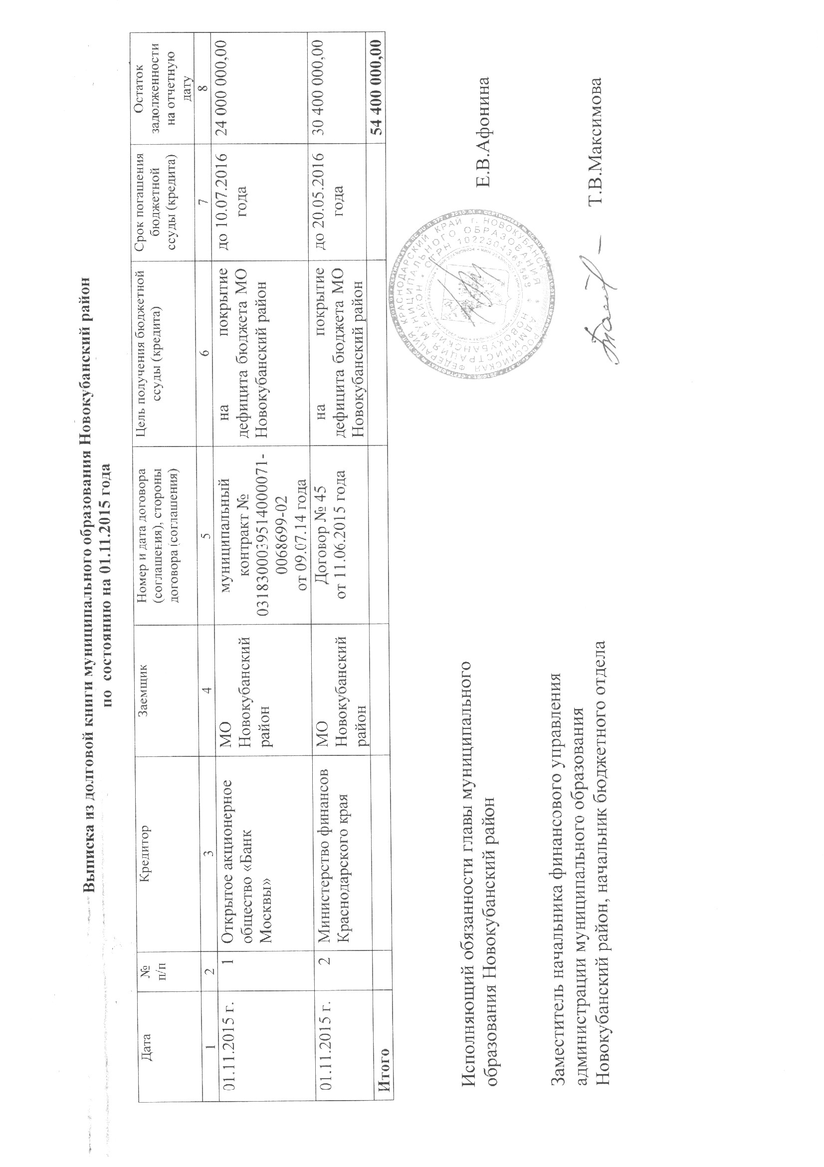 Выписка из долговой книги муниципального образования Новокубанский район по состоянию на 01.11.2015 года